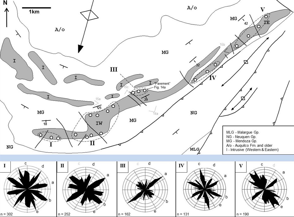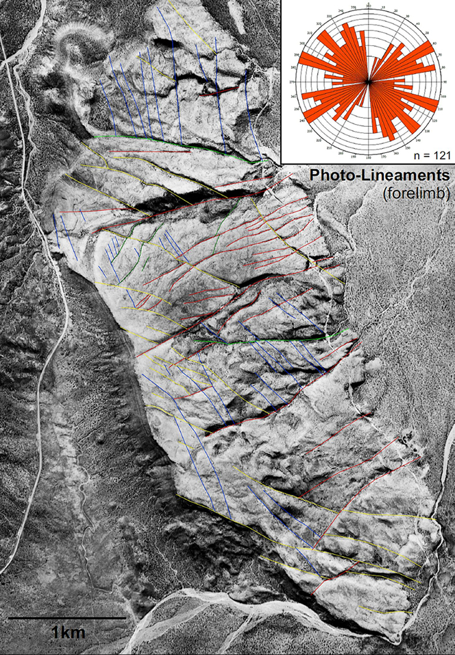 Air photo with lineament analysis (left) and fracture index from outcrop data (right), Malargue Anticline, Neuquén Basin, Argentina (Witte, 2014).