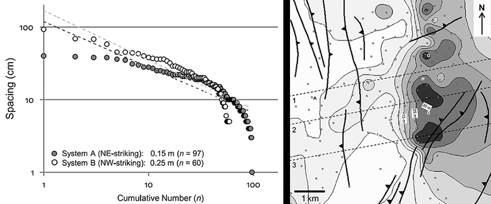 Fracture spacing (outcrop data) from igneous reservoirs, Sierra Azul (left); sill thickness map and well locations (right),3D Earth Model (compressional, thin-skinned, salt-tectonics).