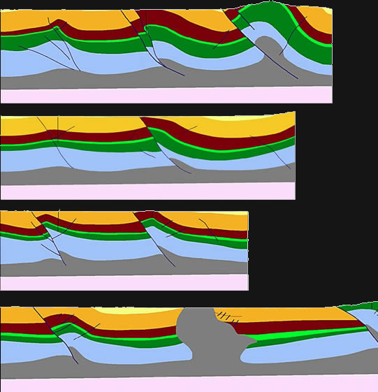 Serial cross-sections through the Santiago Basin, Peru (Witte et al., 2011).Kinematic 2D Model (compressional, thin- & thick-skinned).